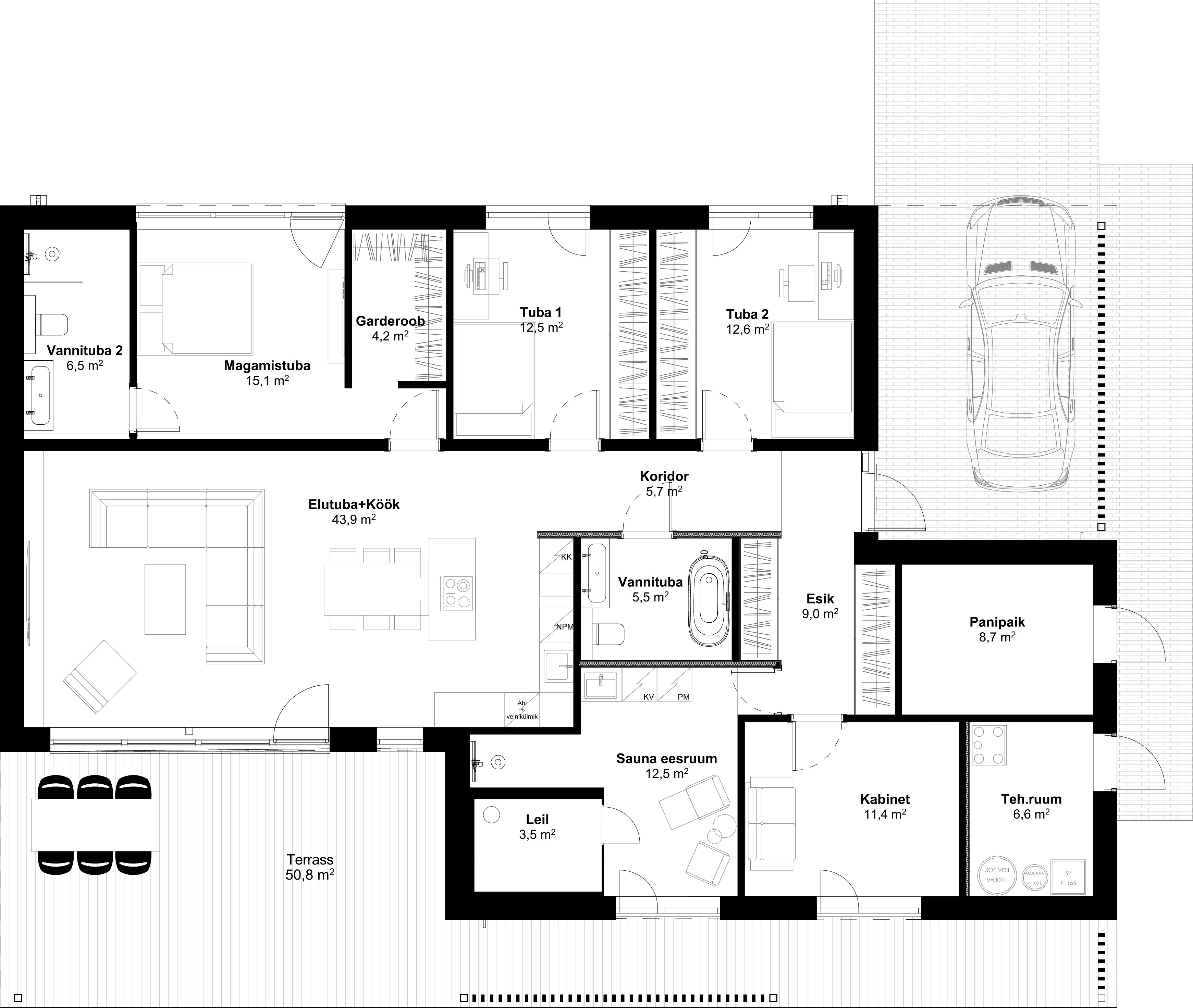 Pärast pikka päeva ootab sind saun koos eesruumiga, kus saad lõõgastuda ja mõtteid korrastada. Suur katusega terrass kutsub nautima suveõhtuid ja pereõhtusööke värskes õhus.